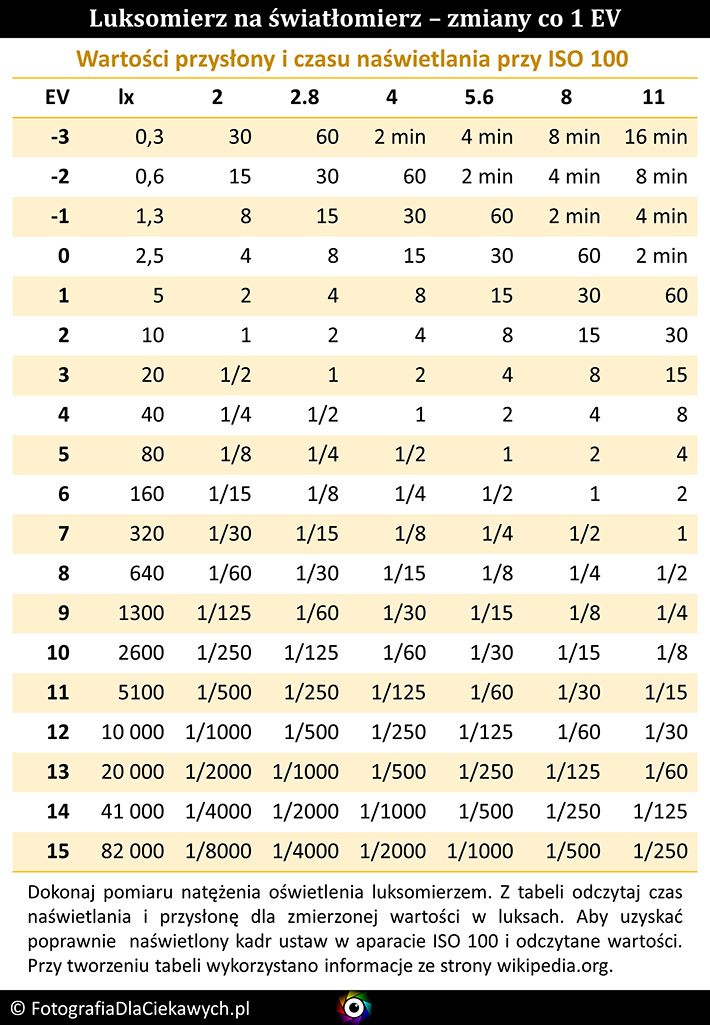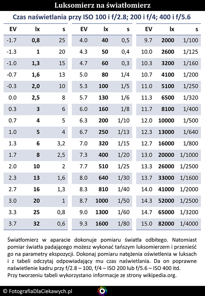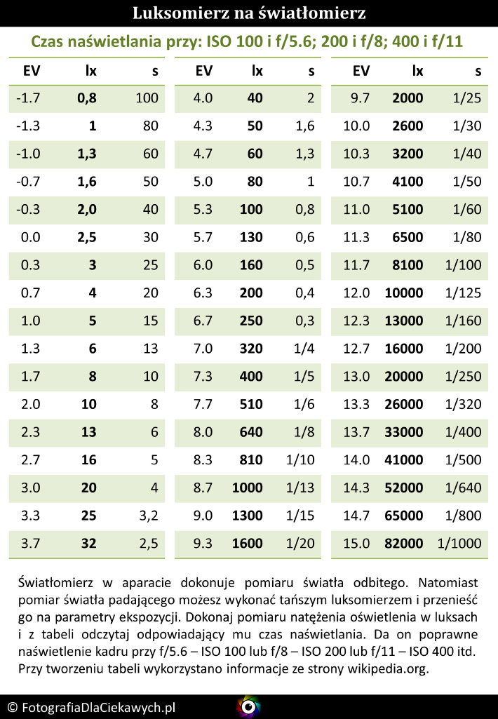 Pierwsza tabela podaje wartości natężenia oświetlenia ze skokiem co 1 EV. Kolejne są dokładniejsze, bo skok zmiany to 1/3 EV.