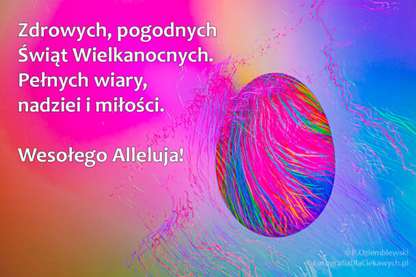 Zdrowych, pogodnych, Świąt Wielkanocnych. Ufności w przyszłość, siły na co dzień, wytrwałości, wiosennego optymizmu i dobrego nastroju. Pełnych wiary, nadziei i miłości. Wszystkiego najlepszego. Wesołego Alleluja!